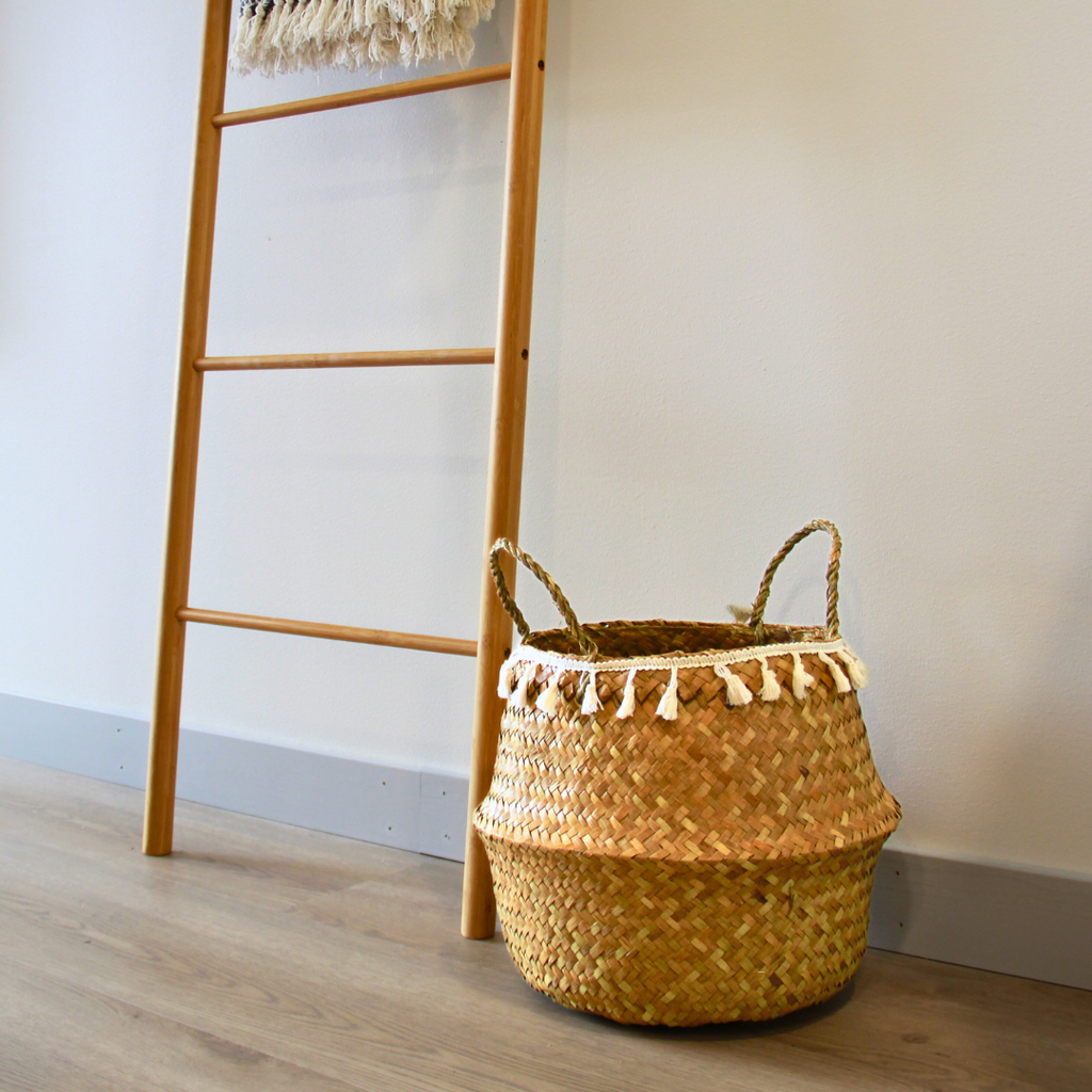 Kokoontaitettava meriheinäkori pompom- koristenauhalla.