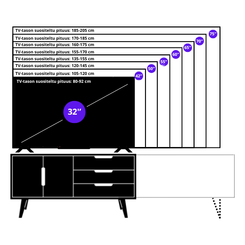 - Runsaasti säilytystilaa: TV-taso sisältää hyllyjä, joissa voit säilyttää DVD-soittimen, pelikonsolit, sekä suoratoisto- ja medialaitteet ulottuvilla ja siistissä järjestyksessä.